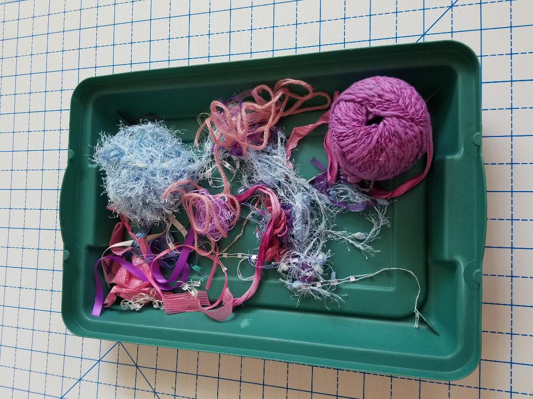 Couching decorative threads and yarns to a long strip of fabric is fun. I  use little pieces that might otherwise be thrown away. Each person’s eyes will blend the colors together differently. Then I randomly cut up the strips to use as fabric. I place the fabric on the design wall. Then I move the pieces  around until I like it.