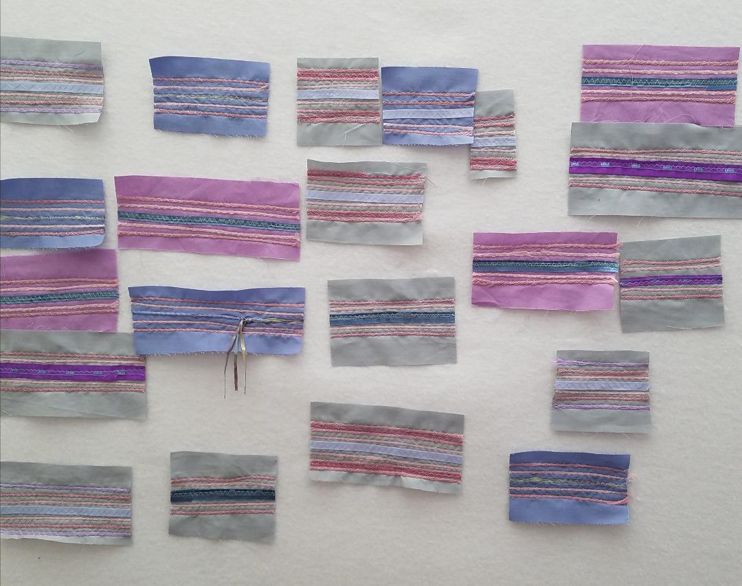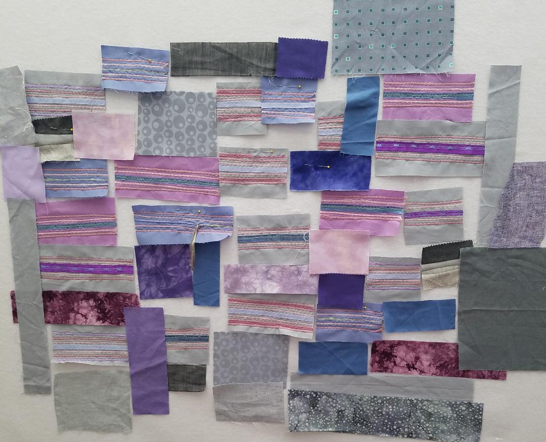 Beginning  to sew the pieces together, I  keep my eye out  to make sure that the balance of the colors and textures is good.