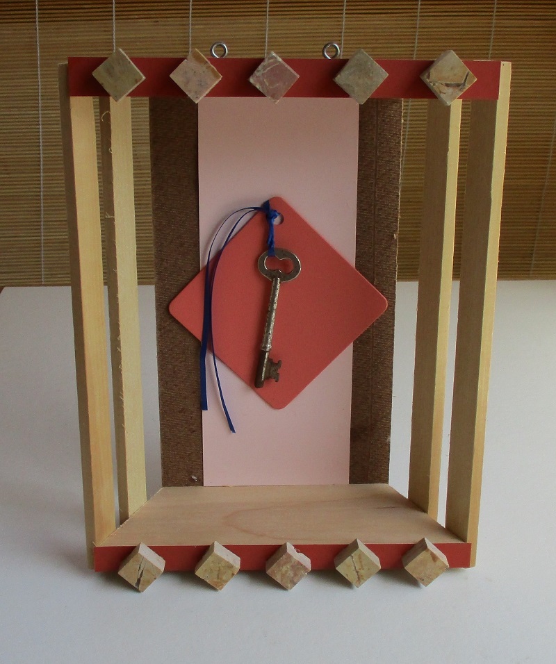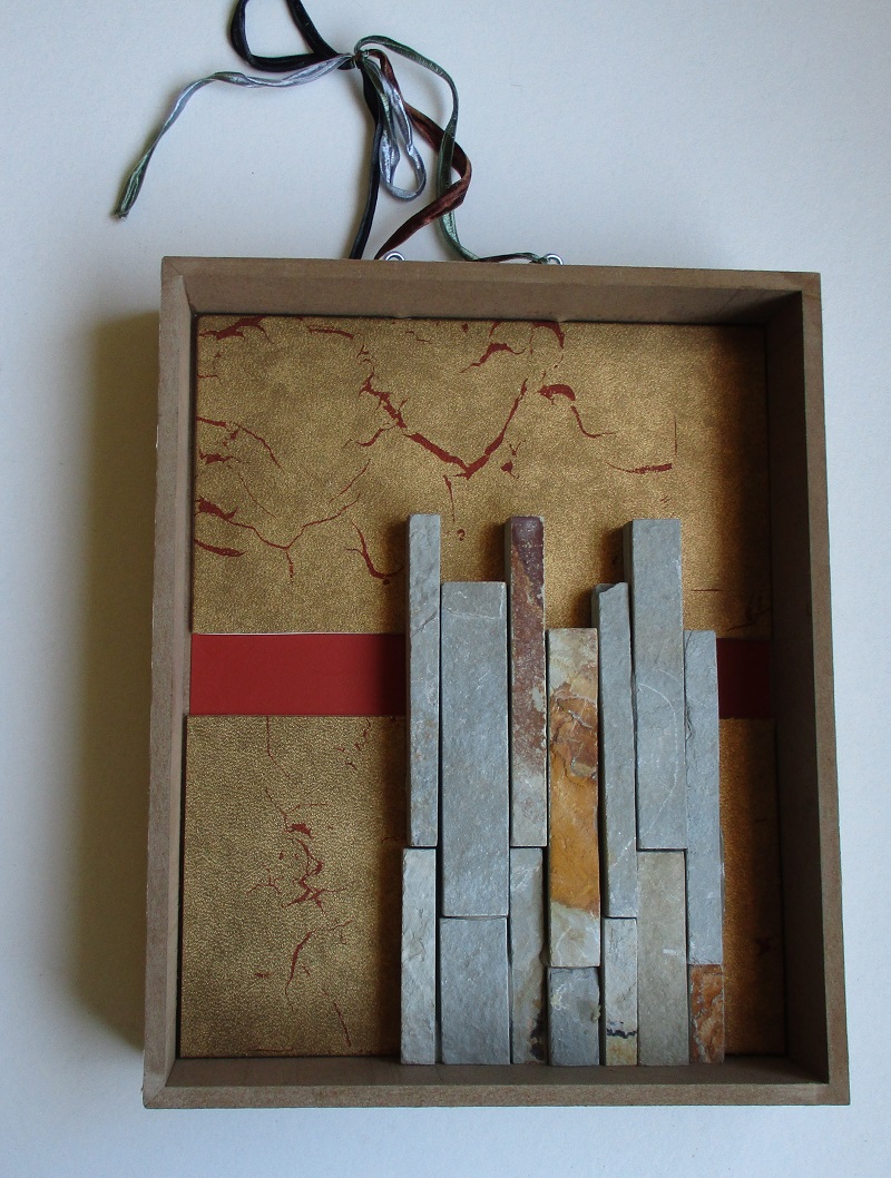 Reusing and reducing materials is a  great motivation for me. These materials were new to me. Wood, fabric,redirected tile samples and paper speak to me more that metal or plastic. I have used some small metal items. The paper I used was discontinued wallpaper samples.