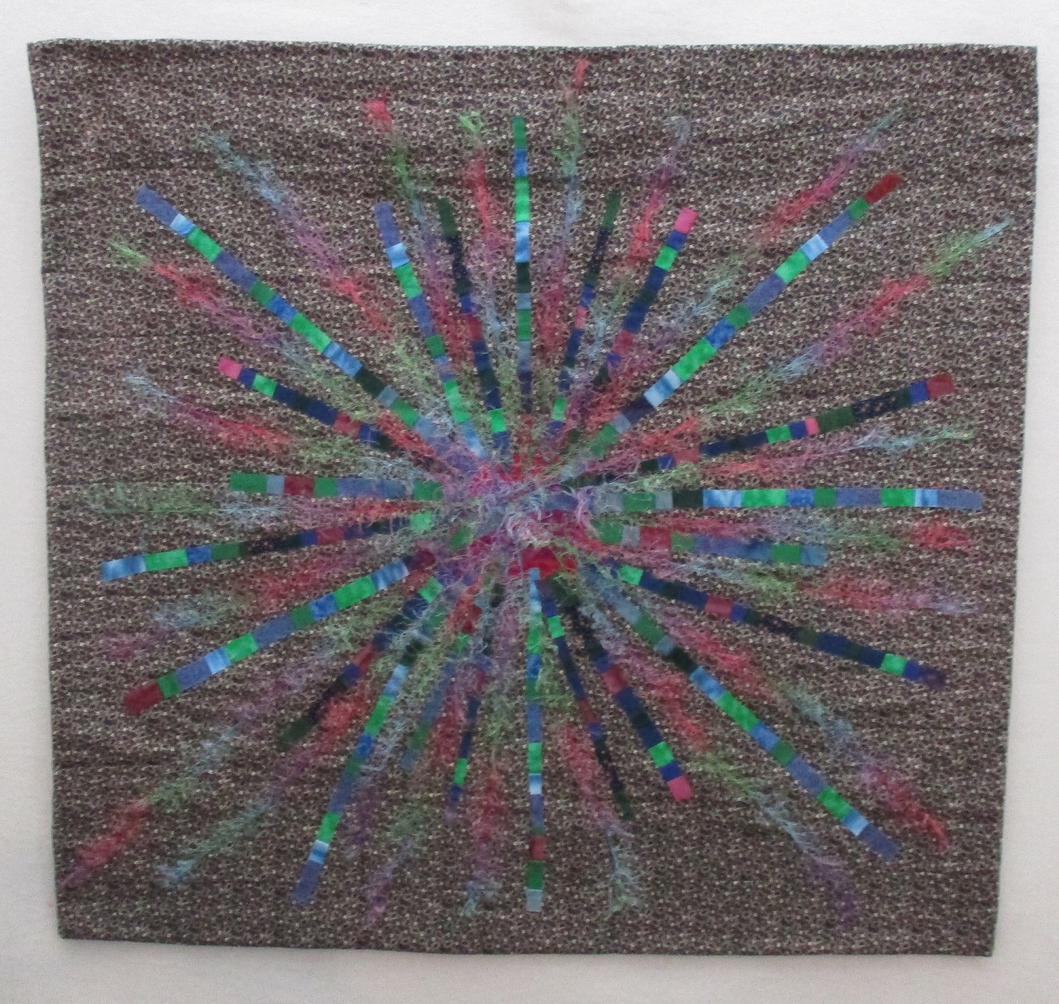 First, Dr. Stephanie Bailey, Physics professor at the University of California, Santa Cruz announced collaboration between local artists and PhD physics candidates. My daughter‘s boyfriend is a physicist. As a result, this former history major thought that participation would be a good way for me to connect with him. However, my student collaborator studies theoretical physics. First,he showed me photos online of collider event displays. Smashing subatomic particles together creates a collider event display.They create predictable patterns and colors. Some look amazingly like fiber. I choose a photo of ATLAS at CERN to make my art quilt.