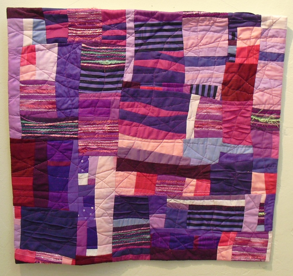Splendid Fairy Wren, 30″ h x 25″ wUnder the Palapa, 27″ x 21″Shore to Sky E, 10″ x 10″Love in the Abstract, an abstract art quilt in purples and pinks,24″ x 26″Winter Sunset, An abstract art quilt with lavander,pink, and grey colors,the finished piece